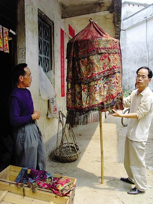 采訪中,李初愛老伯常提起祖先留傳下來的官傘,原來,這傘是冷坑李氏一族的“傳家寶”。李初愛小心翼翼地從房間里的一口木箱中取出折疊好的兩頂官傘,記者見到,木箱底中墊放有鞭炮。“這可以驅蟲防潮,”李初愛解釋說,“村中遇有大喜事,才啟用這兩頂官傘。”