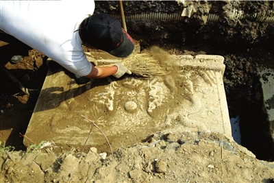 經過村民們連續幾天的挖掘,昨天,昌平區舊縣村發現的石碑終于露出了“真容”,石碑分為寫有碑文的碑身和印有二龍戲珠圖案的碑座,碑文顯示該石碑為重建寺的碑記。昌平區文委和昌平文物所工作人員說,該碑的價值有待進一步研究。