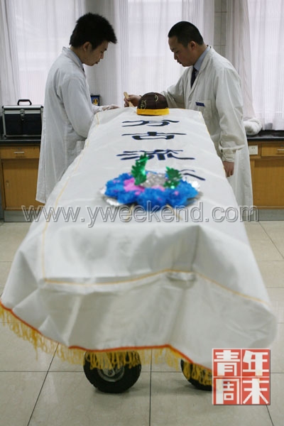 北京時間早7點,外面淅淅瀝瀝下著雨,不大的工作間早已忙碌開來。醫療推車上躺著一位老者,一位戴著口罩,穿著白大褂的年輕人正用酒精給老人擦臉,一點兒點兒,輕柔的,從眼角到下顎,緊接著他把干凈棉布塞進老人的鼻子和嘴里。此時,一個工作人員悄悄問記者:“你看,他(老人)像不像睡著了?