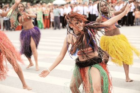 第二篇章“異國風(fēng)情”中,毛里求斯和巴基斯坦表演隊(duì)排練得很投入,當(dāng)頭戴紅花、身著艷麗花朵大擺裙的非洲美女一上場,便吸引了現(xiàn)場男士們的視線。伴隨著歡快的音樂,姑娘們翩翩起舞,不停擺動(dòng)小蠻腰來回旋轉(zhuǎn)舞動(dòng),撩動(dòng)裙擺露出迷人雙腿,她們臉上的太陽、月亮圖騰展現(xiàn)了原始的舞蹈魅力。除了這兩支隊(duì)伍,哥倫比亞民間舞、蘇格蘭風(fēng)笛、俄羅斯民間舞、泰國舞也將亮相天府大巡游。
