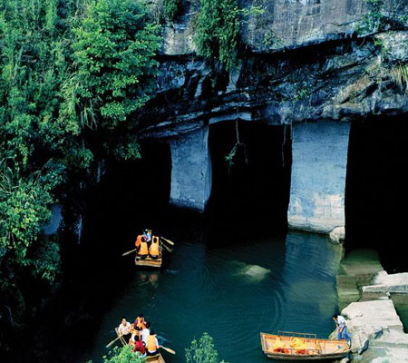 特別值得一提的是洞口處的通海橋,橋下一潭清澈見底的泉水嘩嘩作響,很可能存在活的水源。溯流而下,到了洞內最低處,石壁清晰可見精雕細刻的花紋。雖然這里已經位于新安江水面以下2米,上下落差有25米,但是洞內通風狀況良好,并無任何不適感覺。另外,洞窟的怪異構造使得聲波被石壁吸收,無論多么大聲喧嘩,在洞內都聽不到一絲回音。