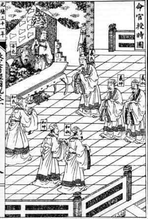 制定歷法,就是“觀象授時(shí)”,對(duì)統(tǒng)治者來(lái)說(shuō)是最重要的事情。天文歷法象征著帝王“君權(quán)神授”的統(tǒng)治權(quán)威。傳說(shuō)堯帝就命天文學(xué)家羲、和二氏進(jìn)行天文觀測(cè)以制定歷法。《尚書·堯典》說(shuō):“乃命羲和,欽若昊天,歷象日月星辰。”當(dāng)時(shí)是以觀測(cè)日出方位和黃昏時(shí)中天的恒星來(lái)確定季節(jié)。根據(jù)書中記錄的“中星”天象,可以推斷堯帝“觀象授時(shí)”的年代約在公元前23世紀(jì)。當(dāng)時(shí)制定的歷法是一年有366天,以置閏月的方法保持與季節(jié)同步。