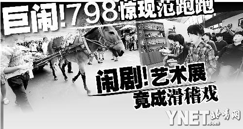 隨后,更多的“作品”給昨日的798平添了不少熱鬧——有趕馬車稱“驢子當(dāng)代藝術(shù)協(xié)會”的,有推小車賣尿壺稱“為人民服務(wù)”的,還有蒙上黑頭套逮誰就問“誰能告訴我?guī)谀膬骸钡摹@場面倒是響應(yīng)了雙年展此前提出的“人人都是藝術(shù)家”的口號。不過,記者從路邊一位不停抱怨的候補(bǔ)藝術(shù)家處得知,這些“創(chuàng)作”在開幕前的一刻都說不算數(shù)了,因?yàn)檫@個單元的策展人突然宣布退出雙年展,也就是說以上的現(xiàn)場行為表演都不再是雙年展的組成部分,而他本人是一位律師,本來準(zhǔn)備搞個現(xiàn)場法律咨詢,“這也是我的作品啊,但是現(xiàn)在不想實(shí)施了。”