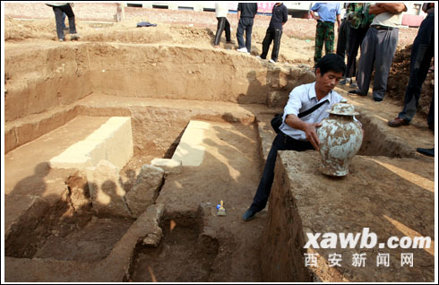 昨日記者來(lái)到木塔寺遺址公園東廣場(chǎng),這是一片占地約10畝的在建工地。西安市文物保護(hù)考古所研究員張全民現(xiàn)場(chǎng)介紹說(shuō),今年8月上旬,這里基建時(shí)挖掘出地宮石門(mén)及石基座。市考古所人員清理發(fā)掘出三個(gè)僧人的墓葬。張全民說(shuō),舊時(shí)僧人去世后多焚化埋葬,墓穴建成地宮形式,其地面上建有靈塔或稱(chēng)舍利塔。此處墓葬的靈塔早年已散失,但地宮及靈塔等能顯示該僧人地位較高。