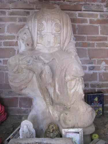 據國家文物局網站消息,該造像砂石圓雕,頭已殘失,高120厘米,寬65厘米,厚50厘米,坐于樹根狀座上,左腿自然下垂,跣足踏一類似玄武的物體,左手平置于左膝,右腿上屈置于座面上,右腳殘缺。坐姿類似于觀音的游戲坐,披發跣足,外著大衣,內著鎧甲,胸部為人字形護心鏡,胸系絆帶,腰扎英雄巾。座后方刻凌亂文字數行,大多已漫漶不可辨識,依稀可見“神□七年”、“正大二□”等。