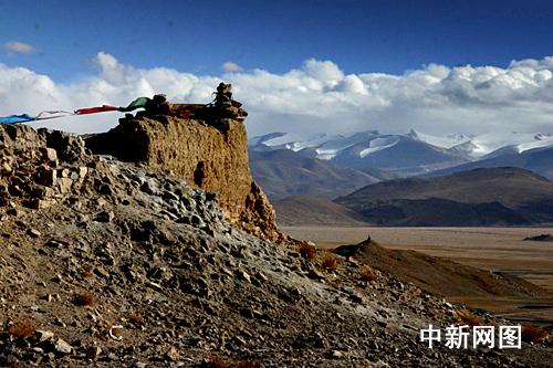 崗嘎鎮黨委書記達瓦次仁告訴我們,這座山名為“崗嘎山”。在山頂,碎石遍布,但還能清晰地看出關帝廟墻腳的走向。山頭懸崖處,是藏民擺放的瑪尼堆,還有迎風飛舞的五彩經幡。放眼望去,幾十公里外,就是綿延不斷的珠穆朗瑪群峰。