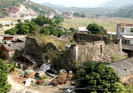 石堡是一個(gè)長方形建筑,長37米、寬31米,墻體內(nèi)外全是用鵝卵石及條石砌成,歷經(jīng)數(shù)百年風(fēng)雨,雖說已經(jīng)沒有了屋頂,只留下高約8米的墻基,但依然雄偉屹立。石堡的三面是護(hù)厝房,外墻也是石頭,但內(nèi)墻是由土夯成的,非常牢固,石堡大門上陰刻“懷珠”兩字。