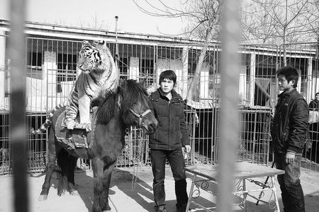 梅正川說,梅莊人馴虎已有近百年歷史。清朝末,有梅莊人開始以街頭現場馴獸表演為生,時間久了仿效者增多,平庸的表演已難以維持生計,一些人開始引入東北虎表演,贏得了市場,并摸索出一套獨特的馴虎方法。