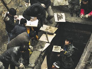 昨日上午10時許,工作人員從槨室內的淤泥中清理出幾片器物,吸引了眾人的目光。經現場考古專家證實,這是兩枚珍貴的竹簡,由于年代久遠,墓室內的結構和環境又遭破壞,竹簡異常脆弱。工作人員隨即將竹簡嚴密包裹起來。由于槨室內的淤泥和積水較多,竹簡的數量和簡上文字內容尚不得而知。