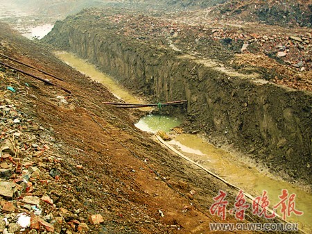 記者20日來到發現古墓的工地。因為下雨,工地中一片泥濘。這個剛被挖出的宋元古墓在一條東西走向的河溝溝底,距離地面約五六米,墓口用兩根棍子示意。起初,墓穴的外形還比較明顯,隨著河溝一側的雨水向墓穴匯去,幾十分鐘的工夫便被淹沒了。