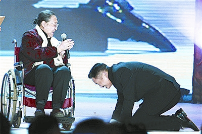 被譽為2010中國第一史詩巨片的《孔子》,1月中旬在北京舉行首映慶典,慶典上孔子的第77代嫡孫女孔德懋女士坐著輪椅上臺,周潤發(fā)便一直在旁邊像子侄一樣跪著聽老太太講話。孔德懋女士盛贊周潤發(fā)在電影《孔子》中飾演孔子的精彩表演,并將寫有“永遠(yuǎn)的孔子”的橫幅贈送給發(fā)哥。這時,周潤發(fā)出人意料地向孔女士認(rèn)真雙膝跪地叩首,隨后,與孔女士溫情擁抱,場面令人動容……