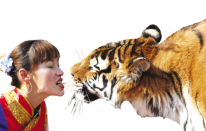 晁改敏被蘇州人熟悉,是在去年11月。那時,她所在的馬戲團與蘇州白象灣景區正式簽約,她和丈夫也告別了各地流動演出的生活,帶著英雄虎爸虎媽和它們的兩只虎寶寶,在蘇州暫時定居。白象灣景區開園的時候,晁改敏表演了叼肉喂虎節目,此前她曾因此節目,被譽為中國第一馴虎女郎。當她叼著肉,老虎從她的嘴邊把肉吞下時,她的口與虎口近乎零距離。此后,游人多的時候,晁改敏總會表演這一節目,晁改敏也因此在蘇州名氣響亮。