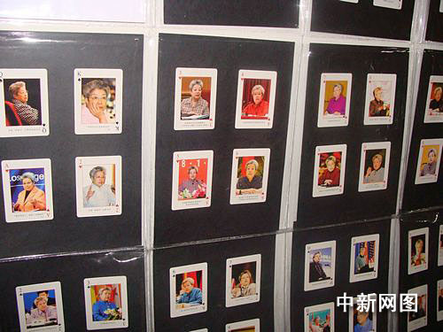 徐州撲克大王姚煥新從收藏的撲克牌中,精心挑選50余副關于女性題材的特色撲克牌并制作成40余塊展板。在巡展現場,記者看到,展板里有以古代女性為主題的《歷代百美圖典》、《中國歷代才女》,也有現代流行的青春偶像《S.H.E》、《臺灣第一美女林志玲寫真》;有中國的《巾幗英模》、《宋氏三姐妹》,也有外國的《鐵娘子》、《折翅的鐵蝴蝶》;有《二戰魅力女郎》,也有現代《中國女兵》。