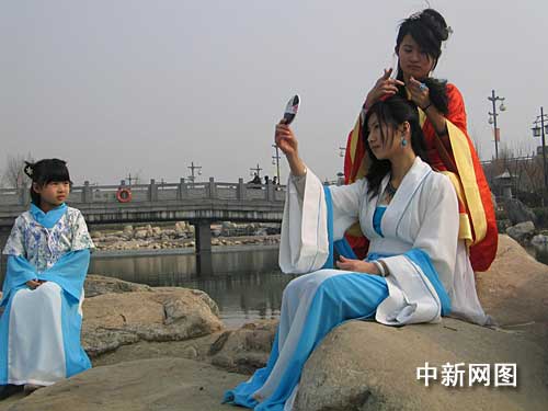 中新網西安3月7日電(記者 冽瑋)敢將十指夸針巧,不把雙眉斗畫長……7日下午,西安的一些漢服愛好者聚集在唐曲江池遺址公園,展示千百年前中國古代女性盛妝打扮的姿容,迎接“三八”國際勞動婦女節。