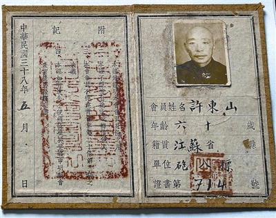 許惠芳捐贈(zèng)的文物包括首義同志會(huì)會(huì)員證、名片、出席辛亥革命紀(jì)念活動(dòng)的請(qǐng)柬、印章等,其中辛亥首義會(huì)員證上寫有辛亥首義同志會(huì)整理委員會(huì)制,會(huì)員姓名許東山,年齡60歲,籍貫江蘇,還有會(huì)員應(yīng)遵守的章程,發(fā)證日期為“中華民國三十八年五月”。
