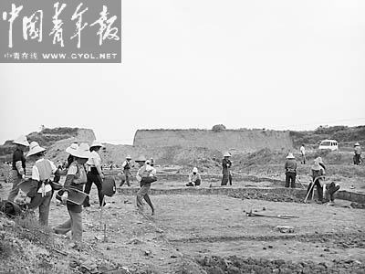 龍首關城墻被挖了一個大缺口,文物部門正在進行搶救性發掘。記者 王俊秀攝