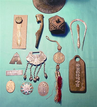昨日,在其武昌家中,朱漢昌向記者展示了他所收藏的部分繪制有“雙旗”圖案的辛亥紀念實物,包括當時的革命將領使用的佩劍手柄、軍政府的出入證、紀念章、各類佩飾、碗碟等,其材質涉及金、銀、銅、鐵、紙、木、瓷、皮、布等。