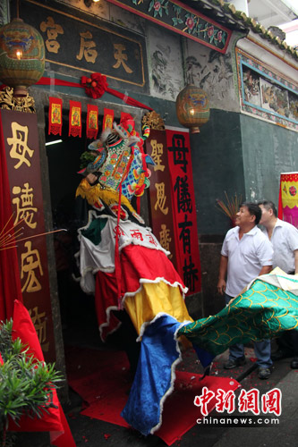 中新網深圳5月6日電(鄭小紅 李海友 鄧小偉)今年5月6日(農歷三月廿三)是“中華海神”媽祖誕辰1050周年紀念日,在中英街,村民們以敲鑼打鼓、舞麒麟、貢祭品、招待八方來客免費品嘗“九簋菜”等流傳已久的民俗方式予以紀念,中英街關口排滿了前來祈福的市民。