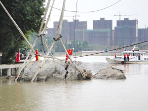 1時14分,巨石剛上升沒多少,只聽見“嘣”的一聲巨響,從巨石上破裂剝落出幾塊石頭,跌落江水中濺起一陣水花!“巨石裂了!”不知誰喊了聲,大家的心都提到嗓子眼,擔心巨石還會進一步開裂,全都眼睜睜盯著“勇士”號的吊臂。“勇士”號上的工作人員當然也意識到了巨石的碎裂,在短暫的沉寂后,開始緩緩將吊纜下放。記者看到,當白色尼龍纜松開后,巨石上出現了一條較大的斷裂口。經過現場專家研究,打撈工作暫停。
