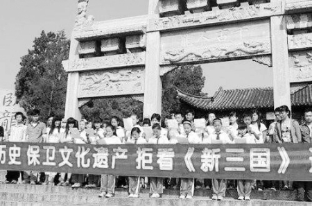 5月29日上午8點,南陽數百網友還在臥龍崗山門前的“千古人龍”牌坊下,拉起條幅,30名小學生齊聲誦讀前《出師表》,游人與市民簽名聲援。活動的最后,幾名網友還抬出一臺電視機當場砸毀,以示對新《三國》的抗議。