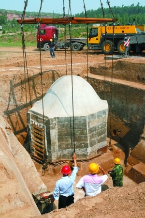 為了確保該墓成功整體搬遷,考古人員用石膏等材料在墓穴外圍做了一層防護(hù),在墓穴東北角處搭置有一個(gè)平臺(tái),平臺(tái)上放置了4根鐵軌作為底座,墓穴整體吊出地面后被放置其上。深坑中的墓室下方被整體架起,墓室成為一個(gè)可以移動(dòng)的整體,然后由吊車(chē)進(jìn)行搬遷。