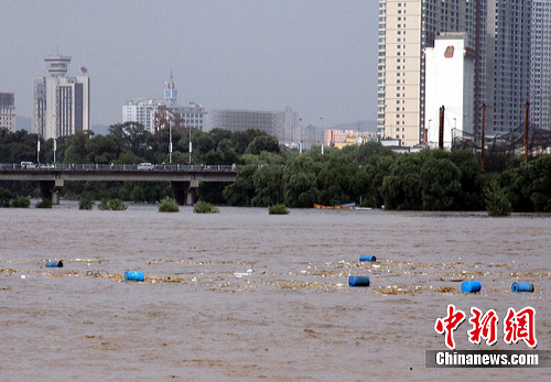 7月28日,吉林省永吉縣境內發生特大洪水,永吉縣經濟開發區新亞強化工廠一批裝有三甲基一氯硅烷的原料桶被沖入松花江中。事件發生后,吉林省迅速采取措施,在松花江沿途設置8道防線進行攔截。吉化公司已派出200多人組成的專業搶險隊伍協助當地政府打撈。中新社發 張策 攝