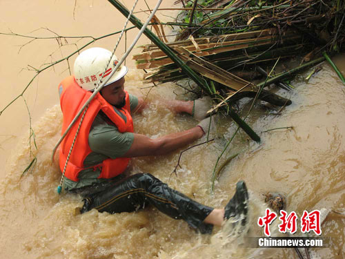 大壩閘門下,水深近6米,水流異常湍急,洪水也異常冰冷,且堆滿了垃圾,雖然消防官兵做好了安全保護(hù),并關(guān)好閘門,下游也安排了漁船隨時(shí)準(zhǔn)備救人,但是水下的情況不明,一不小心就有被洪水沖走或被水下雜物扎傷的危險(xiǎn)。在其中靠近岸邊的一個(gè)孔閘門,大樹與竹子卡在閘門的中間,閘門無法放下,消防官兵只能在異常湍急的水流中作業(yè),由于缺少著力點(diǎn),水下的消防官兵多次沒入水中,險(xiǎn)象環(huán)生,經(jīng)過近20多分鐘的作業(yè)才將雜物捆住。