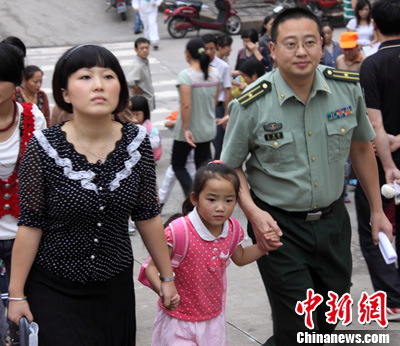 一手拉著東興區人武部副部長彭叔叔的手,一手牽著干媽李敏,新學期第一天,小夢雅和學校其他300多名小學新生一樣,有了自己的新班集體和新同學。