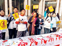 “春風化雨,潤物如‘蘇’”。昨天上午在北京大學百年講堂前,十幾名學生手舉“蘇”字黃旗齊呼:“歡迎支持蘇彥捷老師……”有12年歷史的北大“十佳教師”評選昨日開始。由于三角地的拆除,因此這是北大歷史上首次將“尊師墻”移至百年講堂前,而各院系也首次被集中在一起為候選人拉票吶喊。一時間,各家吹拉彈唱,“有一種‘快男超女’現場拉票時的感覺!痹S多北大學生表示。