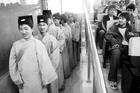 啟動儀式上,10個身穿漢服、頭戴漢帽的男生和10個身穿粉色漢服的女生一起,演繹了傳統禮儀,包括鞠躬、問好等。據團市委書記高京燕介紹,活動將持續三個月,由國學、傳統禮儀等老師組成的講師團,將于4月份在中學、大學開15場講座,教學生學習傳統禮儀、現代禮儀等文化。 (記者 丁亞菲)