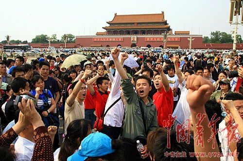 5月19日下午,天安門廣場上聚集了數(shù)萬名參與哀悼活動的群眾,在默哀完畢后,此起彼伏的“中國萬歲”、“中國加油”的聲音響徹云霄。幾名四川籍在京大學(xué)生用四川話激昂高呼“四川雄起”,在場的四川人奮起響應(yīng),很快,來自全國各地的人們都受到強烈的震動,一起吶喊起來,一聲聲感人肺腑的吶喊聲在天地間回蕩,一雙雙舉著國旗的手臂在廣場上有力的揮舞,廣場漾起了一片血色的愛國暖潮。
