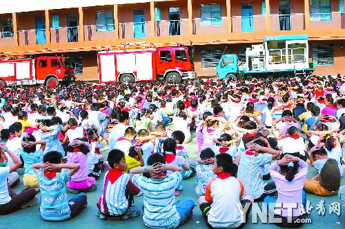 “發生地震了,如果來不及跑出教室,就立即躲到桌子下面或抱頭蹲到承重墻下,等短暫的地震過后,再迅速撤離教室。如果在衛生間內要找墻角抱頭蹲下。”小學生們在消防官兵指導下,都作出同樣動作,在操場演練地震時逃生技能。“以前不知道地震是什么樣的威力,四川地震以后我們學校老師也講了關于地震的好幾次課。”四年級的雯雯說,她學會了“抱頭在桌子或者承重墻下面蹲下”的避震知識,回家要告訴爸爸媽媽。