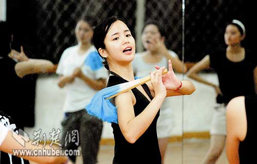 彎腰,擺頭,腳尖點地,滑步……伴著古意濃濃的音樂,七名女孩翩翩起舞,優美的身姿讓人的目光不禁久久停留。“這不是‘魔女幼熙’么?”記者眼前一亮:領舞者長相頗似熱播韓劇《魔女幼熙》的主角。隨意的小卷發披在肩頭,忽閃忽閃的長睫毛下,大眼睛顧盼生輝,這個“魔女幼熙”名叫黃蓓,武大新聞與傳播學院大三學生。每晚給一群將參加“藝考”的高中生上舞蹈課,是她這個暑假的兼職工作。“看清楚啊,像我這樣,兩手伸直,腰一定要用力彎下去……”從學生的熱身準備,到舞蹈中的每個細節乃至眼神,黃蓓都頗為專業地逐個糾正。兩小時的教學時間里,她說得最多的一句話是“再來一遍”。在幫助學生做拉伸動作時,有的初學者疼得哇哇叫,她也毫不心軟,“怕疼是學不好舞蹈的。”
