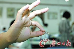 這位男生用“蘭花指”捏住針線。