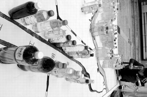 我們每天呼吸到的空氣,被裝進了藍色的氣球里,高高地飄在地圖的最上面。它代表著沈陽市的藍天。氣球下面用透明的繩子拴著幾十張照片。仔細一看,這些照片有渾河沿岸美麗的風光、有夕陽、有綠樹,有老人垂釣、有兒童嬉戲,也有學生們拿著瓶子取水樣的場景。而在地圖的最下方,則是一張平面的手繪渾河、衛(wèi)工明渠等沈陽水質(zhì)圖。圖的上面擺放著大小不一的塑料瓶,瓶里裝著學生們采來的水樣。