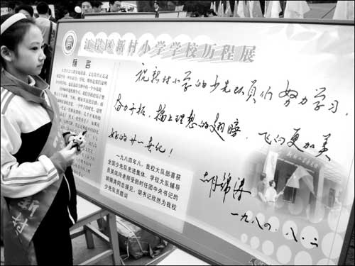 昨日,新村小學的學生在觀看胡錦濤總書記當年的題詞。 通訊員 田立平 樂鋼 攝
