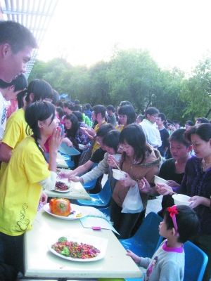現(xiàn)場烹飪比賽結(jié)束后,各參賽隊(duì)伍把自己的成品展示在一排長長的桌子上。現(xiàn)場學(xué)生排起了數(shù)十米長的隊(duì)伍,人手一只碗,一雙筷,擺好陣勢沖著美食長龍開始了“掃蕩”。“七里飄香”雞翅,“盛世金蘭”南瓜煲......各位學(xué)生大廚一邊介紹一邊拉票,場面熱鬧非凡。 (記者 薛冰 實(shí)習(xí)生 林珍 通訊員 何淑賢)