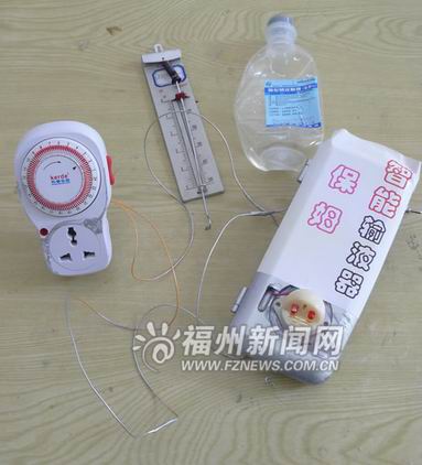 病人輸液難受,陪護的家人更辛苦,一連一兩個小時盯著吊瓶看,就怕發(fā)生血液倒流或其他意外。福州教育學(xué)院附中的黃荻同學(xué)發(fā)明了一種智能輸液器保姆,能在點滴快結(jié)束時及時發(fā)出警報,還能監(jiān)控輸液的速度,減輕護理人員和病人家屬的負擔(dān)。