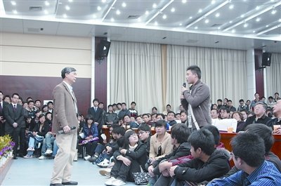 據了解,這場見面會并未對外界媒體公開,僅在校園BBS上發了個消息。晚7時30分,記者作為旁觀者坐到該校經濟學院報告廳內,無意窺見了一場有意思的學生們所稱的“培根叔見面會”。