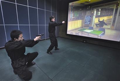 射擊訓練中心的實戰模擬射擊室更有現場感。屏幕上,兩名持槍劫匪突然出現在某銀行營業部,接到報警后,警察將現場包圍,對峙談判無果后,歹徒舉槍射擊,面向屏幕的教官涂明焰和王強同時開槍,兩名歹徒應聲倒地,任務成功!“這是無線電波覆蓋區,訓練者的任何動作都反映在屏幕內!蓖棵餮娼榻B。據了解,控制中心有上千個不同犯罪模擬場景,同一現場中,歹徒可能持刀,可能持槍,也可能投降,現場民警必須根據具體情況,選擇是喊話勸降,是使用胡椒噴霧器、警棍,還是開槍射擊。