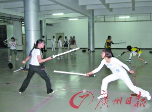 本報訊 (記者盧迎新 實習生 李婷婷攝影報道)暨南大學有個短兵協會,每周的周二、周四、周日晚上,會員們都集中練習。這種對抗性強的運動受到在校博士碩士們的熱捧,尤其吸引了一些平日里斯文纖弱的女博士加入,她們表示:“就算被打也很爽快,認為是一種時尚。”