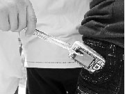 長20~30厘米,狀如普通鑷子,但兩腿末端扁平,很像鴨嘴。“鴨嘴”經過小偷再加工,咬合力和摩擦力加強。探進衣兜后,因尖端圓鈍,不會扎住人,很難發覺。“鴨嘴鑷”專門用來夾錢包。