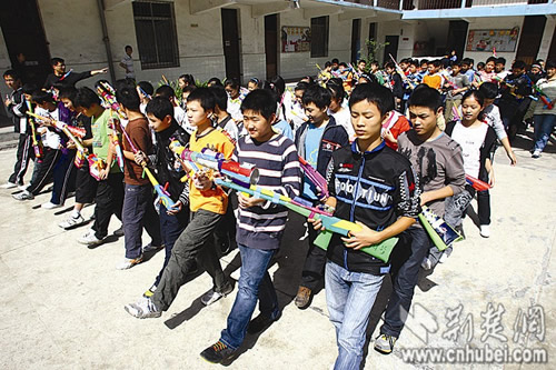 荊楚網(wǎng)消息 (楚天都市報(bào)) (記者張皓 攝影:記者魏錸)昨日下午,武漢市第59中學(xué)上百名學(xué)生,手持各式“槍支”在學(xué)校操場上走正步,體驗(yàn)“閱兵”的感覺。據(jù)介紹,該校最近嘗試新課改,將美術(shù)課與軍訓(xùn)、體育鍛煉結(jié)合進(jìn)行,這些槍支是在近兩個星期的美術(shù)課上,同學(xué)們利用紙盒等廢棄物自己動手制作的。