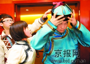 蘇·尼特,來自呼和浩特市二中高二年級。今天他代表蒙古族青少年來到了同心營。一身盛裝的他顯得特別精神,寶藍色的長袍和寶藍色的帽子,蘇·尼特說,這是蒙古族的盛裝,特意穿來為祖國母親過生日,“心情激動得沒法說,一夜都睡不著”。海南黎族的林衡帶來了黎族特色的編織袋,上面的花紋很有黎族特色,“我們黎族是一個熱情好客的民族,這一次和各民族兄弟姐妹齊聚在一起為祖國母親過生日,我們都要拿出最大的熱情。”