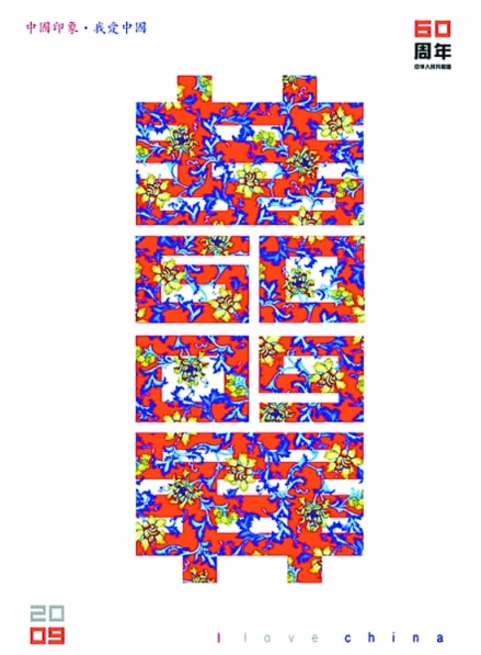 為迎接新中國60周年華誕,該校包裝系教授陳瞻最近特意設(shè)計了這一款海報,其最大的特點(diǎn)遠(yuǎn)看是“囍”,近看又能凸顯出09和60兩個具體的主題,花紋和色彩設(shè)計烘托出喜慶氣氛。