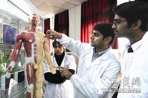 湖北中醫(yī)學(xué)院是教育部首批批準(zhǔn)的接受留學(xué)生的院校之一。目前,在該院海外教育學(xué)院,已有來自20多個(gè)國家和地區(qū)的“洋學(xué)生”,他們用不同的語言,解讀著對(duì)他們來說極其神秘的中華文明。