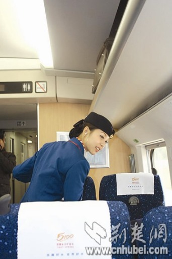 從11月上旬開始,經(jīng)過理論培訓的“準動姐”分別登車至武——京、武——滬線時速250公里的動車組進行試崗操作,開始帶妝為乘客服務。