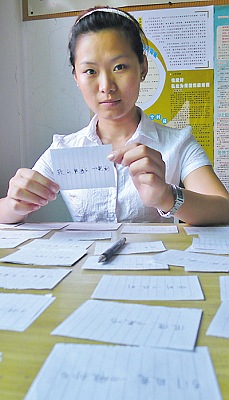 北方人難聽懂南方話,更難學(xué)重慶的地方土話!在萬(wàn)州區(qū)龍沙鎮(zhèn)龍安村任村委黨支部書記助理的遼寧籍大學(xué)畢業(yè)生李飛就是其中一個(gè),她是去年考上我市的“村官”。在9個(gè)月的“村官”生活中,她因不懂當(dāng)?shù)赝猎掫[過(guò)笑話,遭過(guò)白眼。因此,她不停地觀看帶有重慶方言和土話的電視劇進(jìn)行模仿,寫了230頁(yè)土話“名片”隨身帶,天天念。