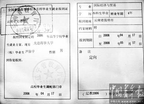 隨后,杜青拿到了學(xué)校發(fā)給他的《報到證》,報到單位為云南省交通廳,報到時間為2008年4月17日到2008年5月17日,《報到證》的“備注”一欄寫著“定向”。而此時,他已經(jīng)畢業(yè)離開學(xué)校21個月了。