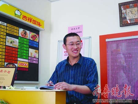 經過考察,王欣欣得知吉祥餛飩店是一家加盟連鎖店,操作流程簡單,適合他創業初期的選擇。家是臨沂的他選擇了把店開在濟南!半x家近,而且這邊有個親戚!